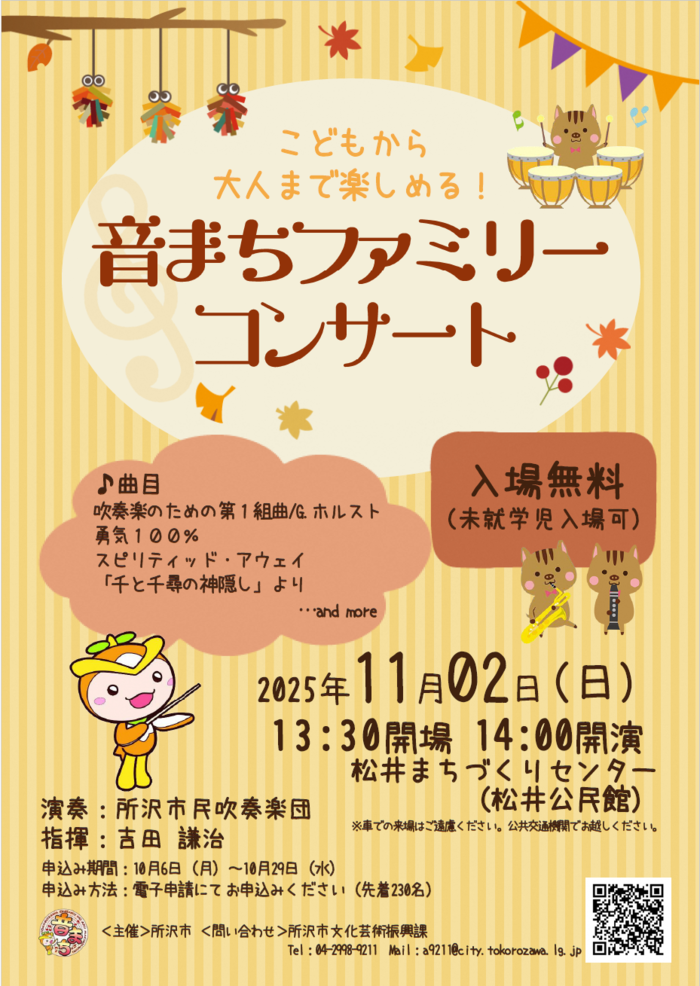 音まちファミリーコンサートは、子どもたちやその保護者等にとって身近な場所でコンサートを開催することにより、気軽にクラシック音楽等に触れる機会を創出するイベントです。今回は、所沢市民吹奏楽団(外部サイト)による、吹奏楽の演奏をお届けします。