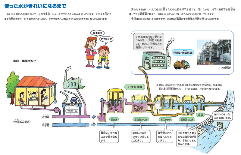 所沢市内の家庭や工場などで使われた水は、和光市にある埼玉県新河岸川水循環センター(下水処理場)まで流れていき、きれいにしてから新河岸川に戻しています。