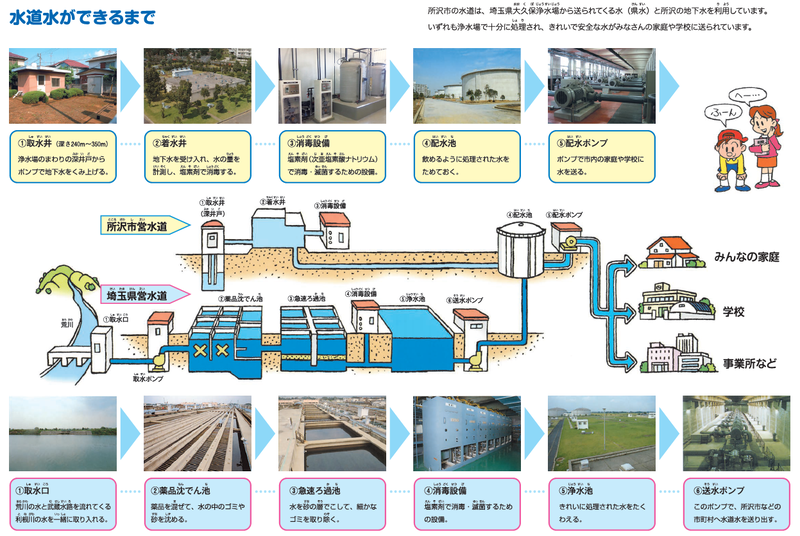 所沢市の水道は、9割を埼玉県から購入し(県水)、1割を地下水でまかなっています。県水は、さいたま市にある埼玉県大久保浄水場で処理され、所沢市内の4つの浄水場に送られます。そこで地下水と混ぜ合わせて処理を行い、きれいで安全な水をみなさんの家庭などに届けています。