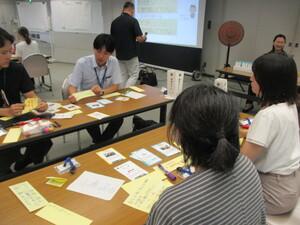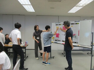 ゼロカーボン達成のために「自分が〇〇に取り組んだほうが良い」、「〇〇(組織など自分以外の他者)が○○に取り組んだほうが良い」といったアイディアをポストイットに書き出して、全体で共有しました。