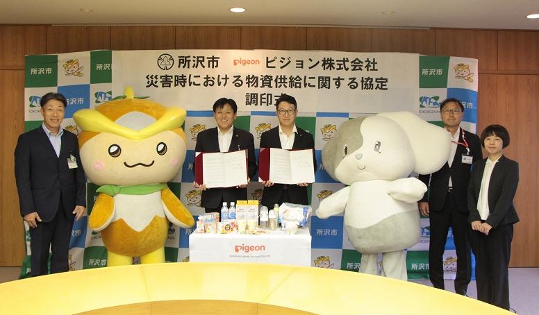 (写真左から)所沢市 危機管理監 青木一圭、所沢市イメージマスコット トコろん、所沢市長 小野塚勝俊、ピジョン株式会社 執行役員 ベビーケア事業本部長 大口将利、ピジョンブランド公式キャラクター ほわぴぴ、ベビーケア事業本部 事業推進部 病産院・自治体グループ マネージャー 渡辺広孝、株式会社官民連携事業研究所 執行役員 事業部長 山崎友香